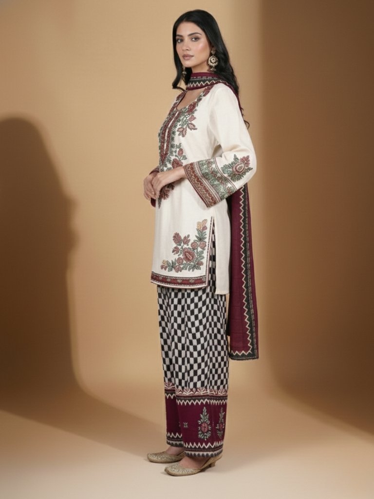 This beautiful set features a rich embroidered ivory kurta with detailed floral patterns and statement sleeves.
