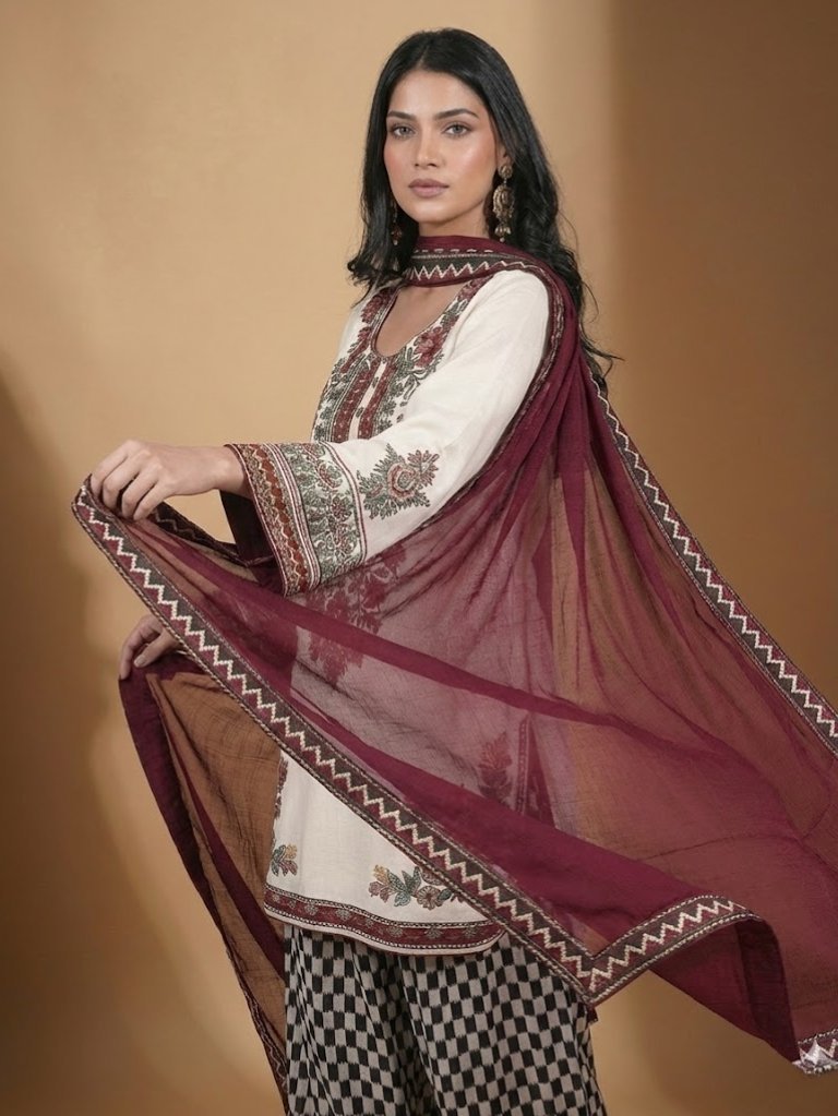 The geometric printed trousers add a modern twist, perfectly balanced with the deep maroon dupatta.