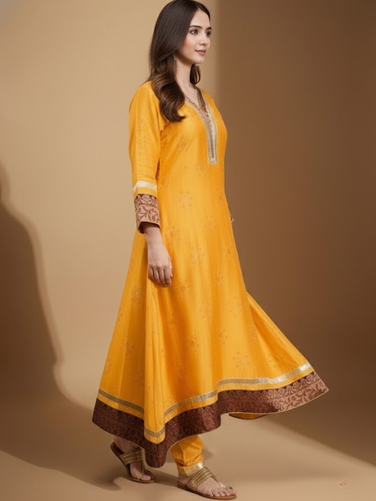 This elegant mustard kurta features delicate embroidery with beautifully detailed maroon borders on the sleeves and hem.