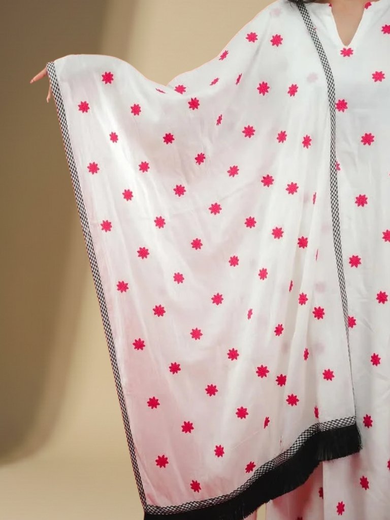 Paired with a matching dupatta detailed with a subtle black border, it completes a graceful ensemble.