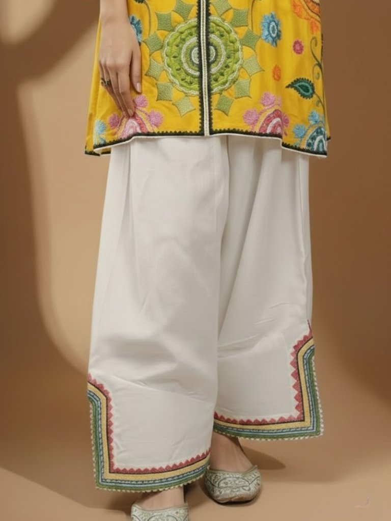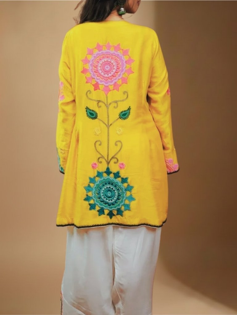 The soft yellow fabric paired with wide embroidered trousers creates a stylish, breezy silhouette.